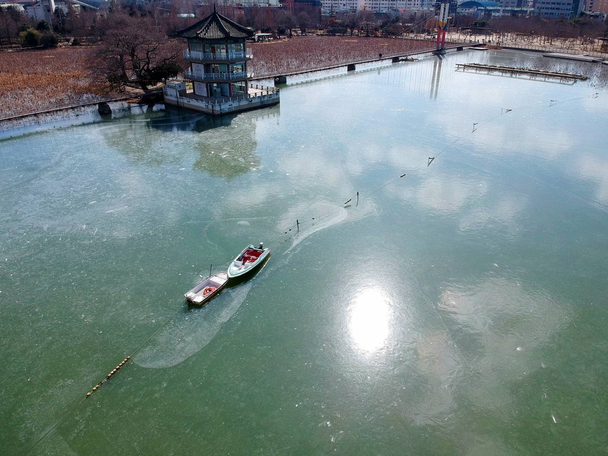 바람이 세게 불었던 탓인지 이번에는 덕진연못 얼음에 흰 방울들이 보였다. 하늘에서 보니까 굉장히 튼튼하게 잘 언 것 같았는데, 얼음판 두께가 얼마나 될런지는 모르겠다. 옛날에는 겨울에 덕진연못 물이 얼면 저 얼음 위에서 스케이트나 썰매를 타곤 했다고 들었다.