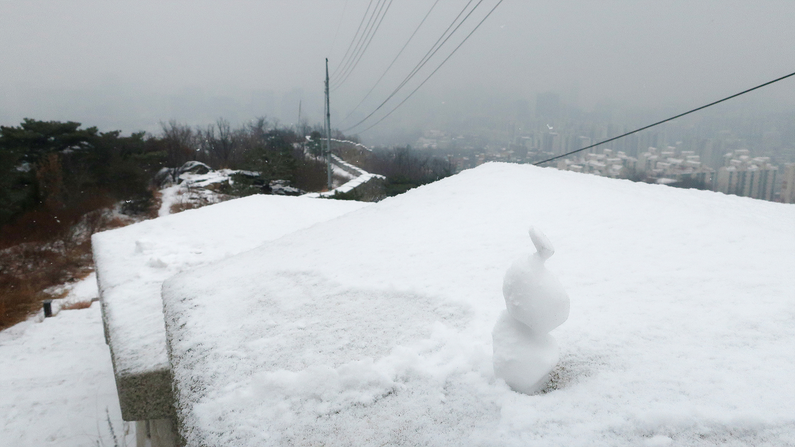 아무튼 그런 ‘눈 쌓인 울타리’가 인왕산 등뼈 가장 높은 능선을 따라 이어진다. 좌우 침엽수 숲은 눈에 그렇게 쉽게 잠기지 않고 약간의 푸릇함을 남겨두고 있다. 발을 디딜 때마다 약간의 미끄러움이 감지된다. 성벽에 가까이 붙어서 가다 보면 종종 경사가 급한 길이 나온다. 오른쪽으로 살짝 떨어져서 한 발 한 발 힘을 줘 내딛는 게 낫다. 길과 성벽은 멀어졌다 가까워졌다를 반복하며 조금씩 북쪽으로, 그리고 위로 나아간다. 조그마한 눈사람이 성벽 위에 앉아 있었다. 언제부터 여기 있었던 걸까? 이런 것이 한두 개가 아니다. 군데군데, 아주 전망이 좋은 곳마다 이 친구들이 자리해 있다.