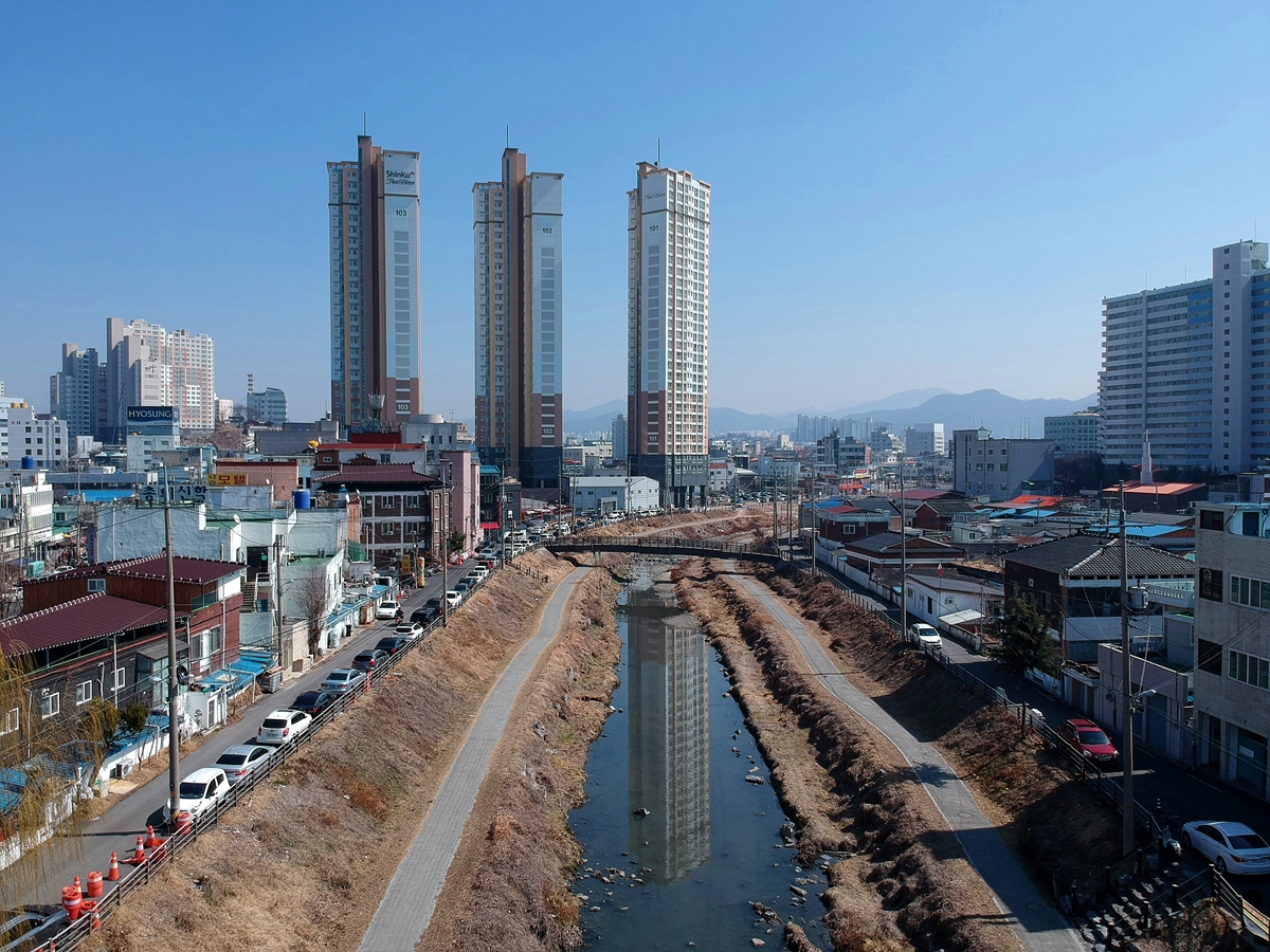 고저의 대비가 확실하다. 저 모래내도 복개돼 있던 걸 뜯어낸 지 얼마 안 되고, 왼쪽의 고층 아파트도 최근에 지어졌다.