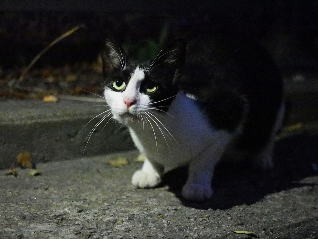 해는 곧 지고, 날은 어둑어둑해지고, 가지고 있던 카메라의 감도를 25600까지 올렸다. 노이즈 감소 기능이 작동하면서 마치 아지랑이처럼 밀린 화면 속에는 그러나 고양이의 안광이 선명했다.(사실 옆에서 휴대폰 플래시를 비춘 것이다) 사람을 별로 경계하지 않는 것처럼 보인 이 작은 고양이는 간식 한 봉을 뚝딱 해치우고 다시 어둠 속으로 들어갔다.